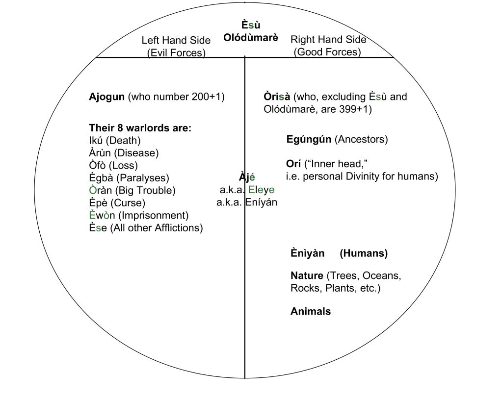 In Yoruba cosmology, Èṣù is positioned at the centre—the Ajogun (malevolent forces) are on the left, and the Òrìṣà (benevolent forces) are on the right. Èṣù and the Àjẹ́ occupy the middle, neutral status, balancing both positive and negative forces.